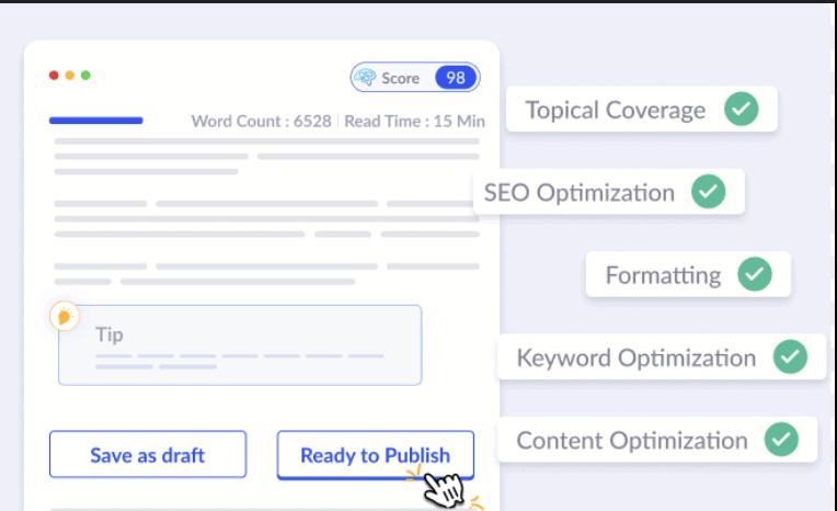 Quality evaluation happens through Scholar. Scholar scores clarity, intent satisfaction, information gain, factual accuracy, and structural completeness using ranking-aligned criteria. This replaces subjective editing with performance-based scoring, which goes far beyond Copymatic’s draft-level feedback.