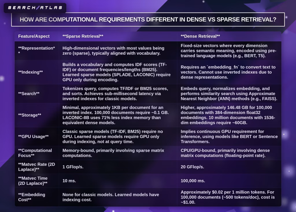 How do computational requirements differ between dense and sparse retrieval? Dense retrieval requires GPU computation and higher memory, while sparse retrieval operates efficiently on a CPU with minimal resources. Dense retrieval performs neural encoding and vector comparisons, which increases computational cost. Sparse retrieval performs term matching and scoring, which reduces infrastructure complexity. Learned sparse models introduce GPU usage during indexing but maintain efficient query execution.
