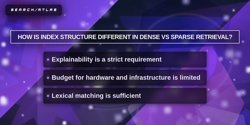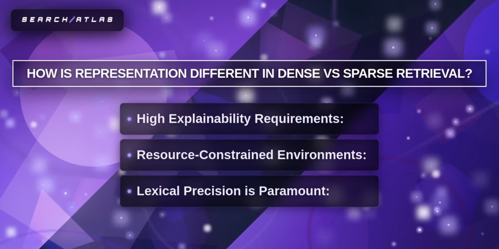 Sparse retrieval fits environments that require transparent ranking (legal, finance, healthcare). Sparse retrieval exposes term-level weights, which enables full auditability and deterministic debugging. - Use Dense Retrieval for Semantic Search (Meaning-Based Scenario).