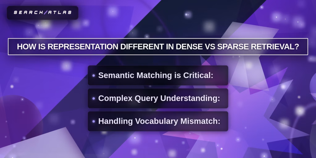 Dense vs sparse retrieval differs in representation, matching, indexing, computation, and performance, where dense retrieval uses semantic search and sparse retrieval uses keyword search. Dense vs sparse retrieval comparison shows that dense retrieval encodes meaning through neural vectors, while sparse retrieval encodes exact terms through weighted token vectors. Semantic search vs keyword search defines the core divide, where dense retrieval focuses on contextual similarity and sparse retrieval focuses on lexical overlap.