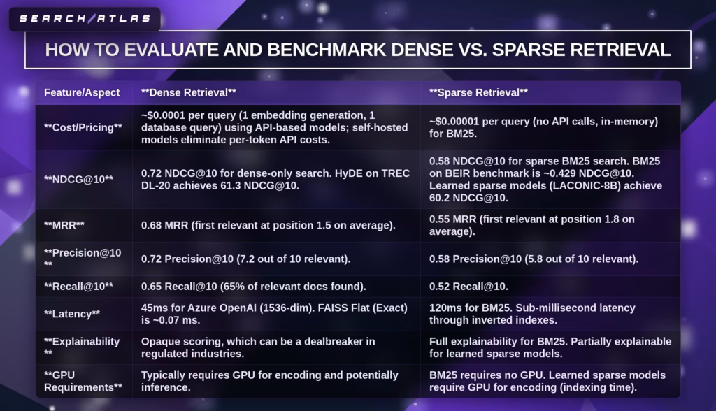 Dense vs sparse retrieval evaluation requires combining ranking metrics, recall analysis, latency measurement, and cost benchmarking, which ensures accurate comparison across semantic and keyword search systems.