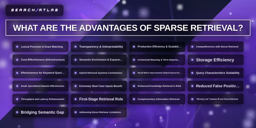The advantages of sparse retrieval establish it as a core component of keyword search, hybrid retrieval pipelines, and cost-efficient large-scale systems, where precision and efficiency are critical.