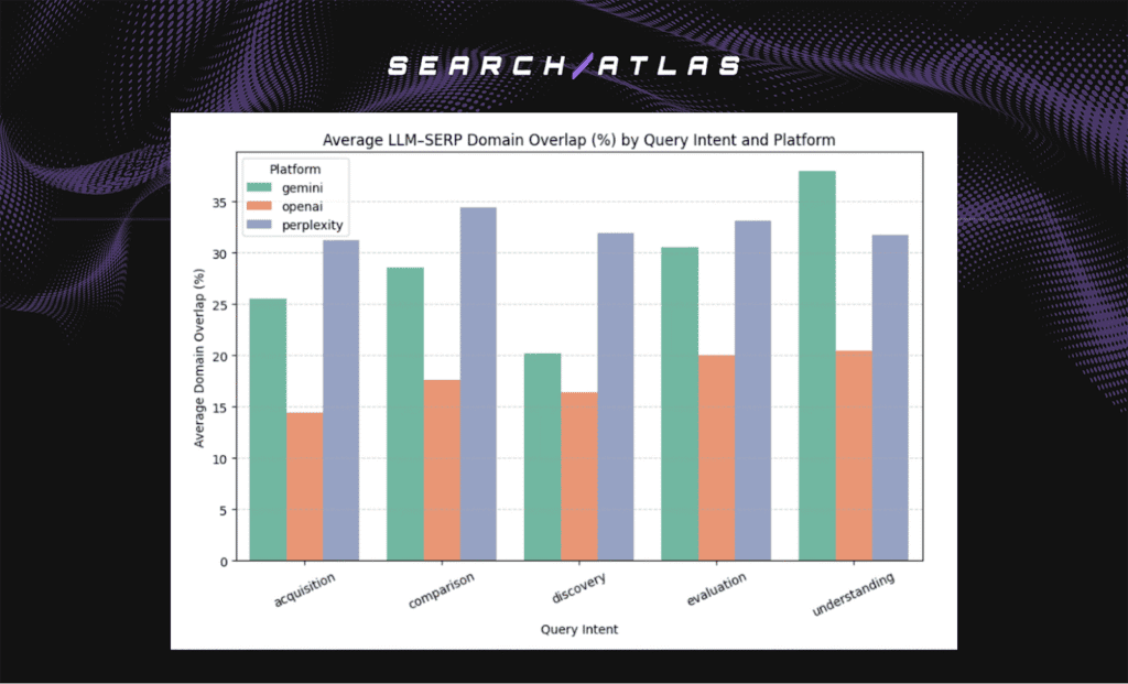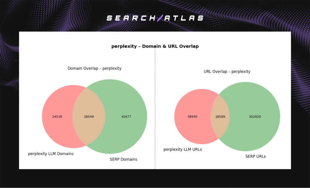 I, Manick Bhan, together with the Search Atlas research team, analyzed 18,377 semantically matched LLM–SERP keyword pairs to measure how retrieval-augmented and reasoning-based models align with Google’s indexed results. The breakdown to show how Perplexity, GPT, and Gemini differ in domain and URL overlap is listed below.