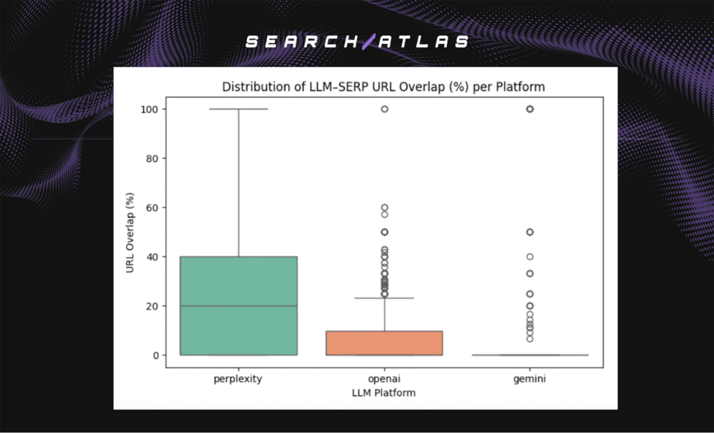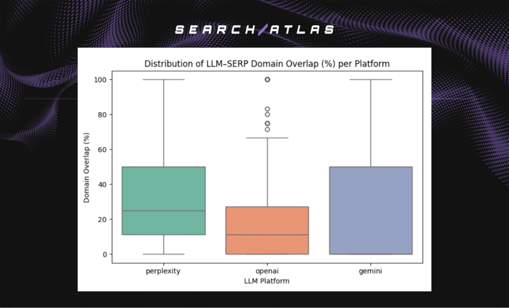 Perplexity shows the highest and most stable overlap. Its live web retrieval enables citation of the same authority domains visible in Google results. OpenAI (GPT) shows lower overlap, reflecting its reliance on internal training rather than live search. Gemini displays a mixed pattern, with selective retrieval that varies by context.