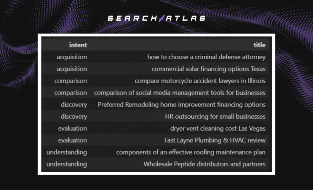 - Segmentation. Models (Perplexity, GPT, Gemini) and query intent (Informational, Navigational, Transactional, Evaluation, Understanding).