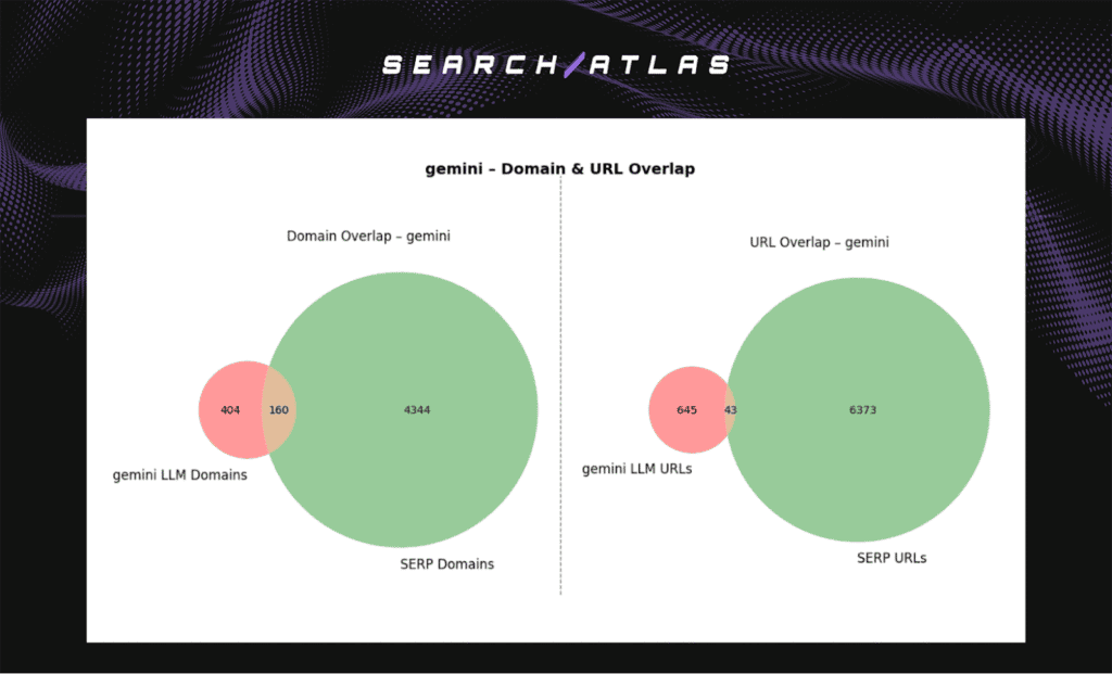 The overlap data indicates that Gemini filters aggressively, citing only high-confidence or context-specific domains. While its domain overlap appears moderate, the small absolute count of shared URLs reveals that Gemini emphasizes accuracy and source verification over breadth.