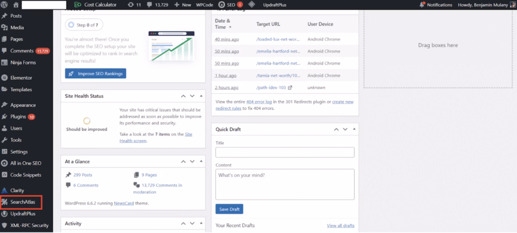 After installing and activating the Search Atlas WordPress Plugin, go to Search Atlas in the left menu of your WordPress dashboard.