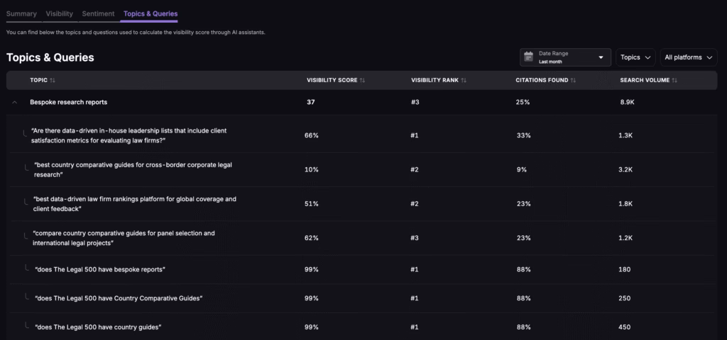 To identify which practice specialties AI associates with your firm, use the Topics & Queries dashboard. This dashboard lists the topics and queries that trigger mentions, along with visibility scores, rankings, citation share, and related search volume.