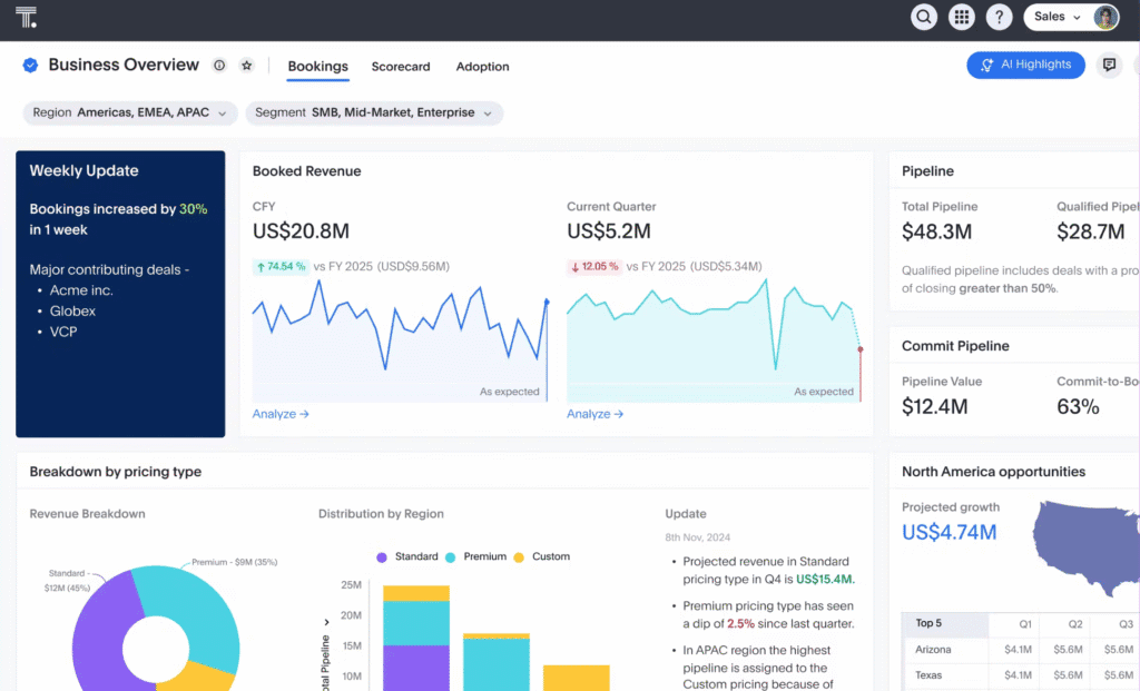 | Zoho Analytics | Self-Service BI and Automation | Data sync, AI insights, forecasting | From $30 / month |