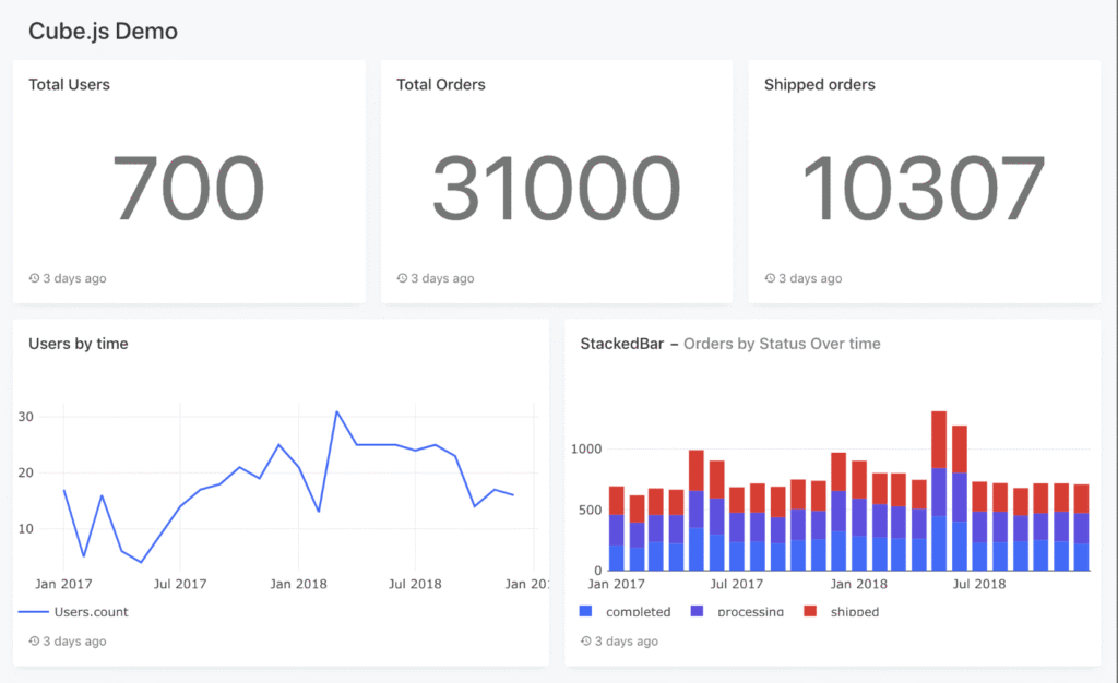 Cube.js is an open-source headless BI platform that provides a semantic layer for building custom analytics applications. Cube.js sits between data warehouses and front-end interfaces, serving consistent metrics and dimensions through APIs that power dashboards, reports, and embedded analytics.