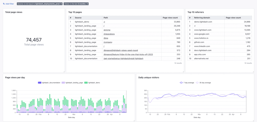 Lightdash positions itself above Looker Studio for dbt-native analytics. It integrates directly with dbt’s metric layer, relationships, and YAML configuration. Lightdash embeds BI into the data transformation workflow, giving data teams a unified environment for development and analysis.