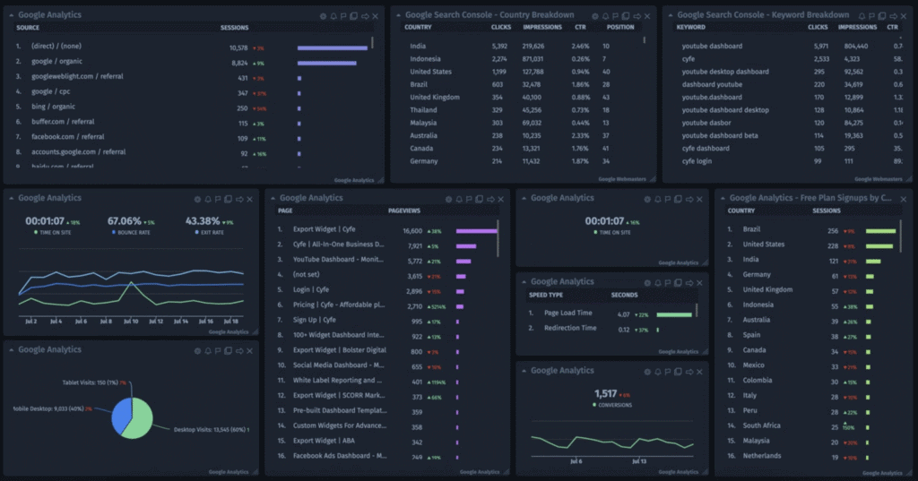 Cyfe is an all-in-one dashboard platform that centralizes data from marketing, sales, finance, and analytics tools into a single, customizable view. Cyfe uses prebuilt widgets to pull KPIs from popular services and presents them in real-time dashboards for quick decision-making.