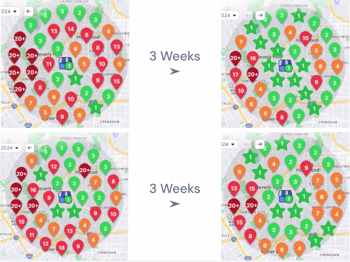 To analyze the results, the client used pins to represent nearby locations, and a local SEO heatmap was employed to track and analyze the improvements in search rankings over time.