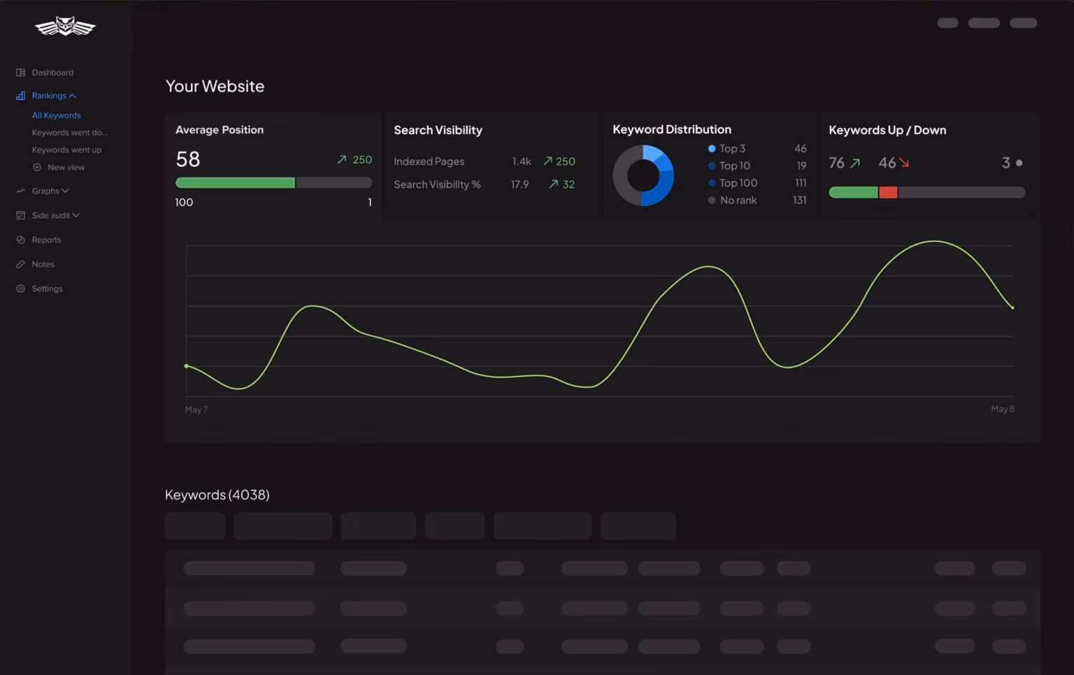 Core features in Nightwatch include daily keyword tracking, SERP feature segmentation, Click Potential metrics, Search Visibility Score, and volatility monitoring. The platform offers white-label reporting, keyword grouping, API access, and emerging AI search visibility tracking across systems such as ChatGPT, Gemini, and Claude.