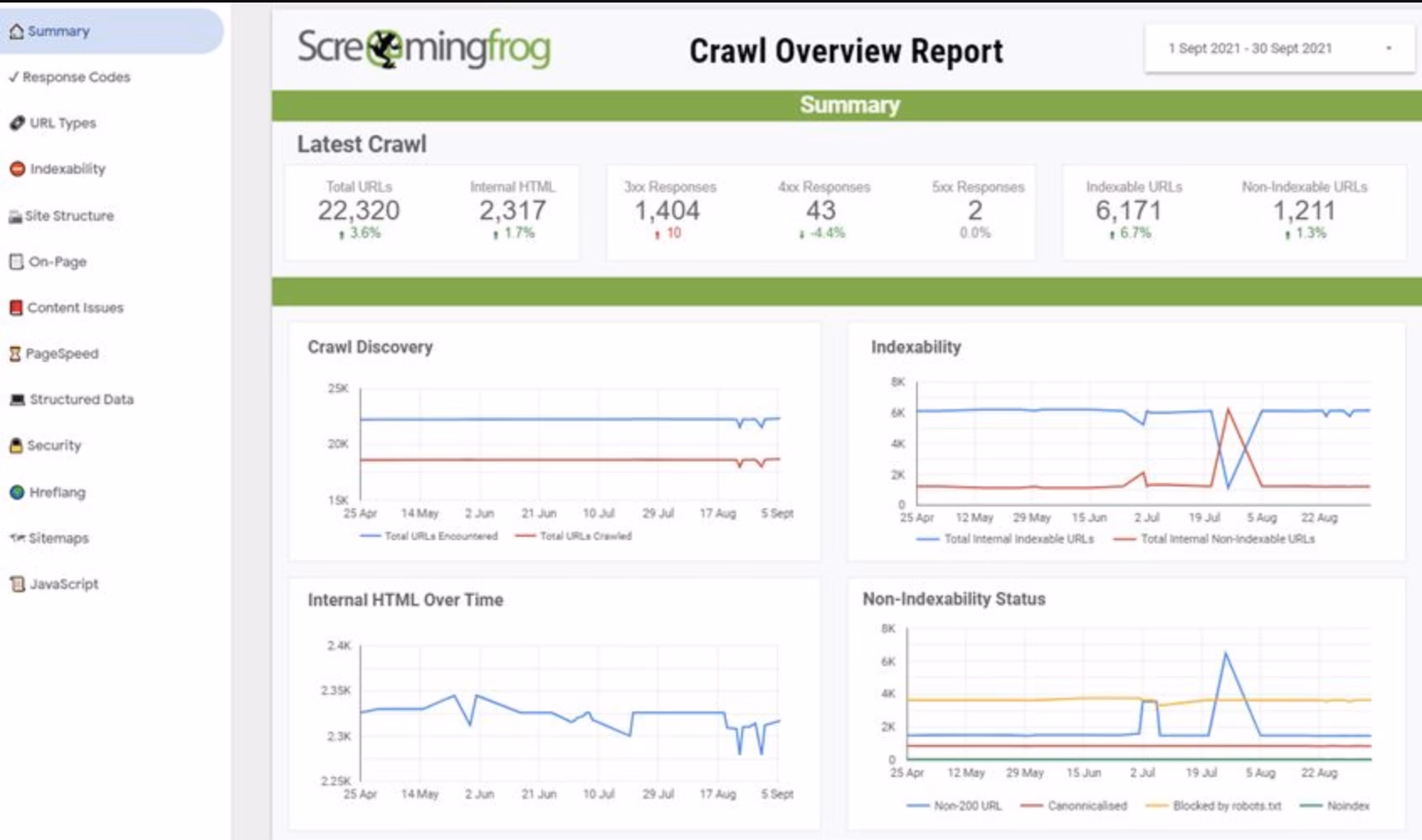 Core features in Screaming Frog include real-time crawl monitoring, configurable extraction rules, and crawl comparisons that surface structural changes over time. The crawler processes both static and JavaScript-rendered pages while collecting titles, headings, links, canonicals, directives, and response codes.