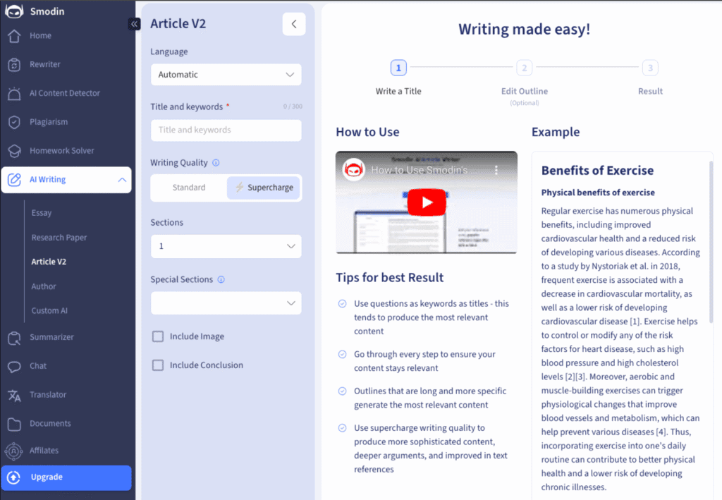 Smodin is an AI writing platform built for academic tasks, text rewriting, and citation generation. Smodin enables essay drafting, paraphrasing, summarizing, translation, and plagiarism detection inside one unified workspace designed for students and research-heavy workflows.
