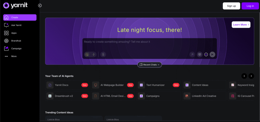 Yarnit is an AI content marketing platform built to create story-driven, on-brand campaigns through a blend of writing, design, and strategy automation. Yarnit combines multiple AI agents into one workspace, producing personalized content that fits a brand’s tone, visual identity, and audience expectations.