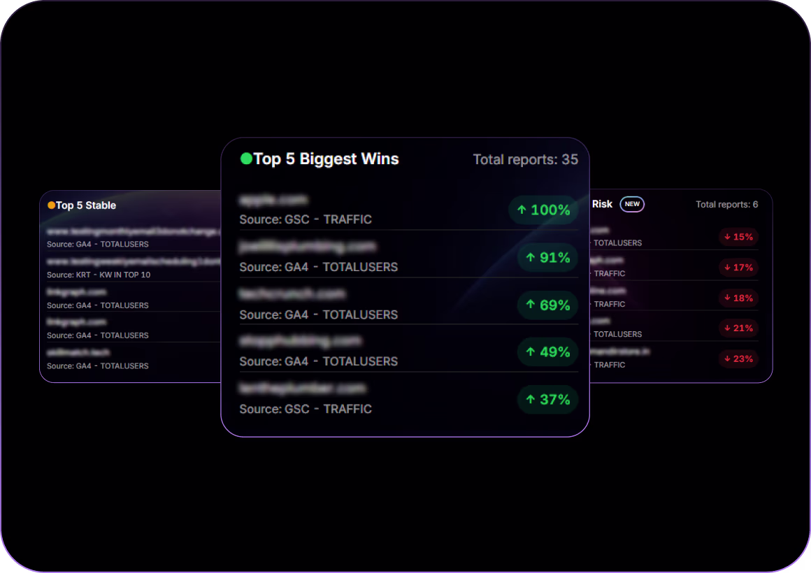 Portfolio Summary™ by Search Atlas is the first enterprise-ready dashboard that transforms complex multi-account data into a single health score. It automatically categorizes accounts as Biggest Wins, Stable, or At Risk so agencies and enterprises can act faster.