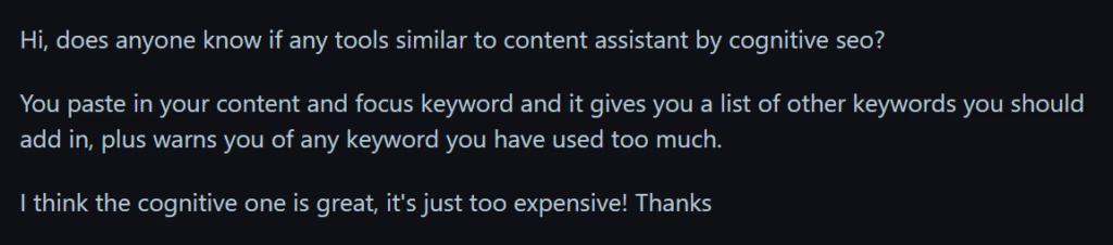 Some other users consider cognitiveSEO too expensive, although they are satisfied with the tools. The comment is from several years ago when cognitiveSEO pricing was lower, at $99. Today, the price for the cheapest plan is $129.