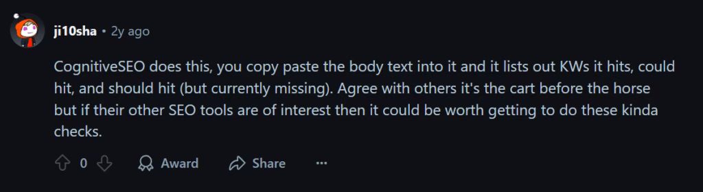 Reddit users do not mention cognitiveSEO as much as other SEO tools. Some posts speak positively about the cognitiveSEO company when explaining how to perform backlink profile cleanups.