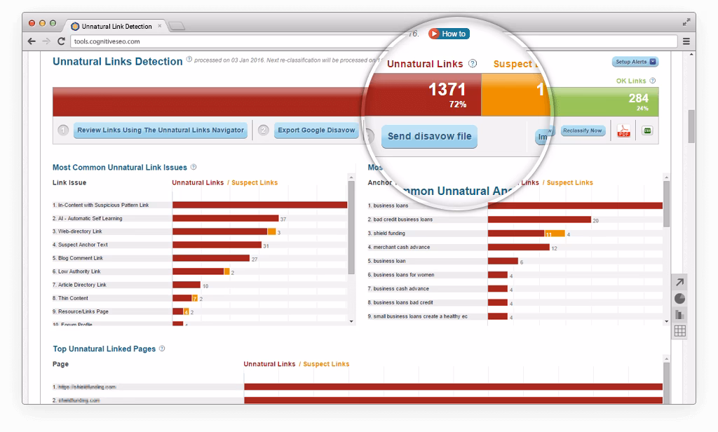 The system generates disavow files automatically and offers link audit capabilities. Users can set up alerts for new unnatural link detection and track penalty recovery progress. The tool provides link profile analysis that shows which links pose ranking risks.