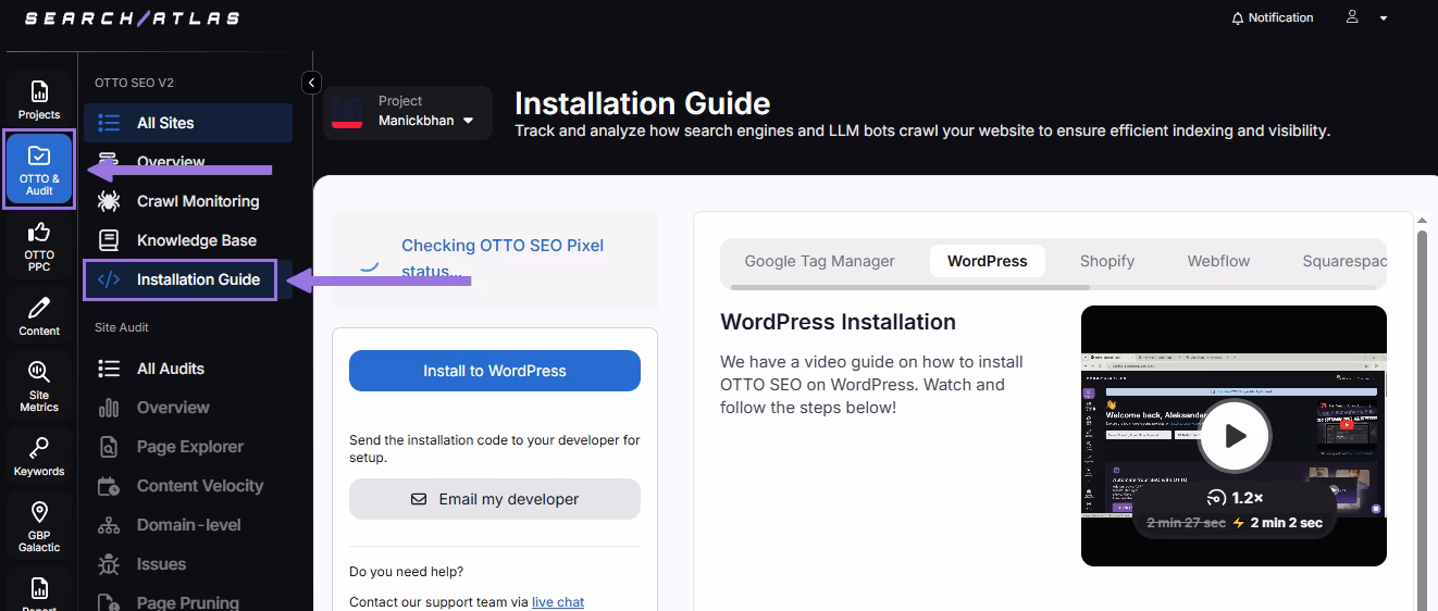 Note: It’s necessary to go through the Site Audit on your project before activating OTTO.