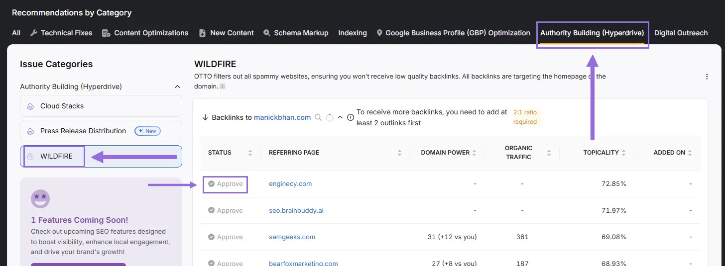The Search Atlas WILDFIRE feature is located within the OTTO SEO system. Search Atlas WILDFIRE builds safe medical backlinks by connecting your health pages with relevant domains in the healthcare ecosystem. You receive 1 inbound link from a trusted health domain for each 2 outbound links placed to matched medical partners. Every exchange is screened for domain health, medical topic match, and spam score.