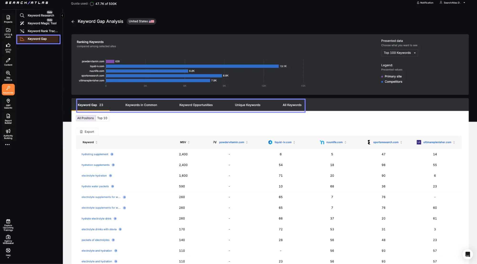 - The Search Atlas Keyword Gap Tool compares medical keyword rankings across up to 6 competitors and identifies valuable health search terms missing from your content.