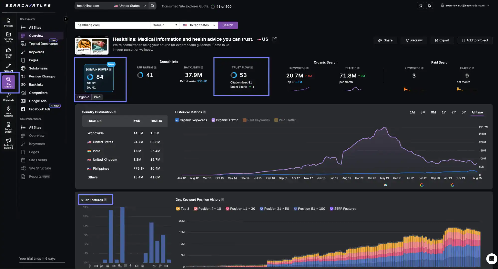 The Search Atlas Site Explorer displays live medical rankings, authority trends, and health topical coverage across service clusters. Use Domain Power, Trust Flow, and other metrics from the Search Atlas Site Explorer to evaluate which healthcare themes need deeper coverage, such as preventive care, specialty treatments, or patient education.