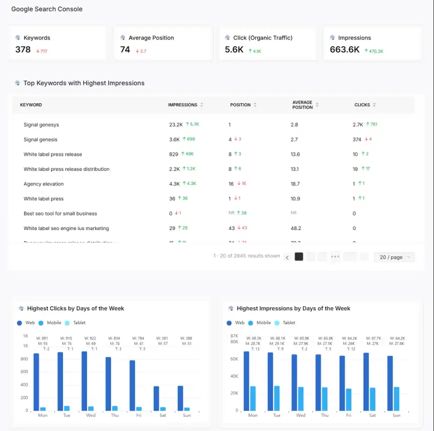 - Live Google Search Console Integration. Monitor over 45,000 active health keywords by position, impressions, and clicks. Segment data by medical specialty, treatment type, or health entity, with automated flagging for position drops, click surges, or patient intent shifts.