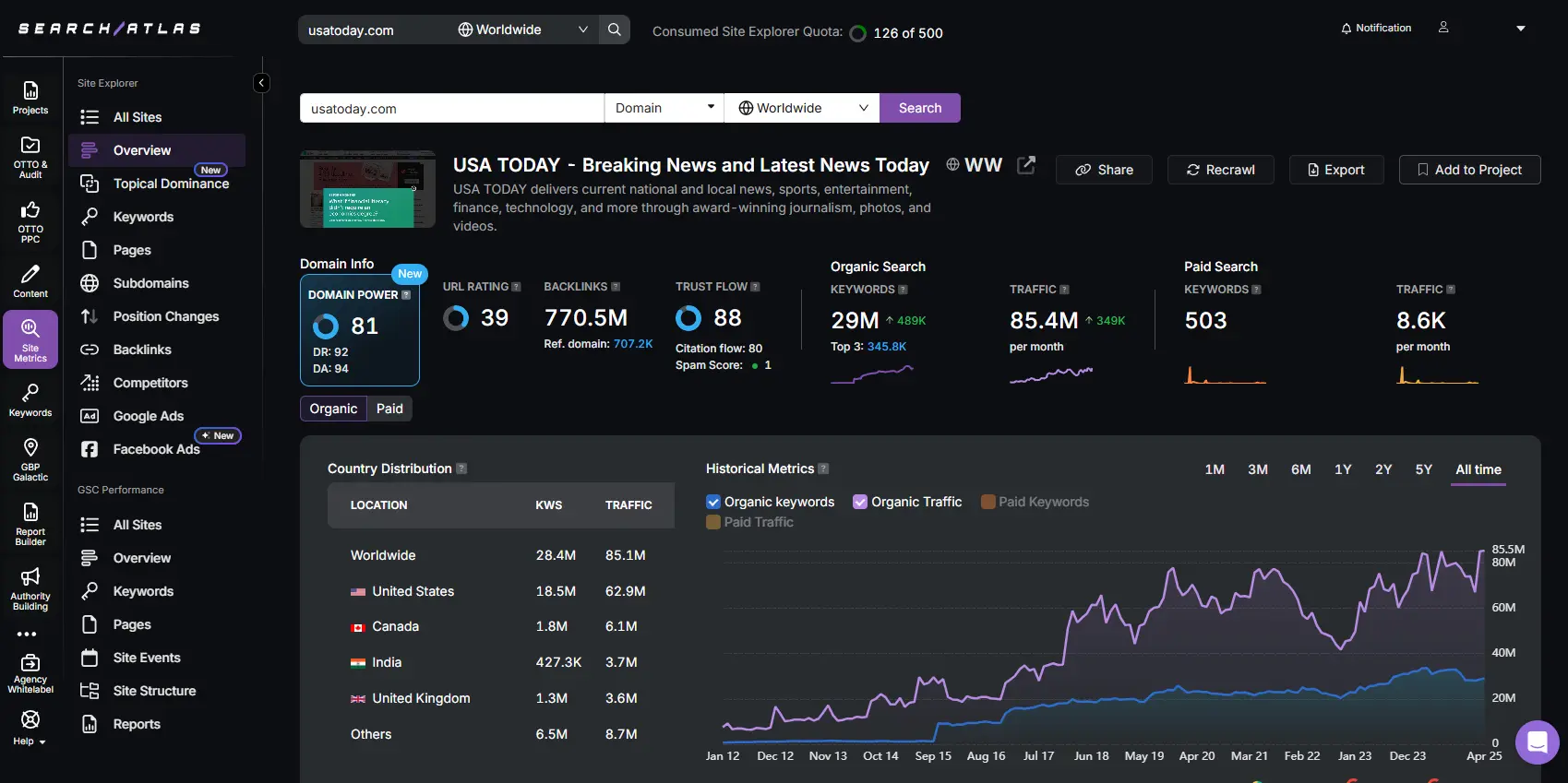 Search Atlas consolidates data from Google Search Console, Ads, Local SEO, and rank tracking into customizable reports. Track performance across destinations, tour types, and seasonal travel searches through reports that highlight what drives actual bookings and travel inquiries.