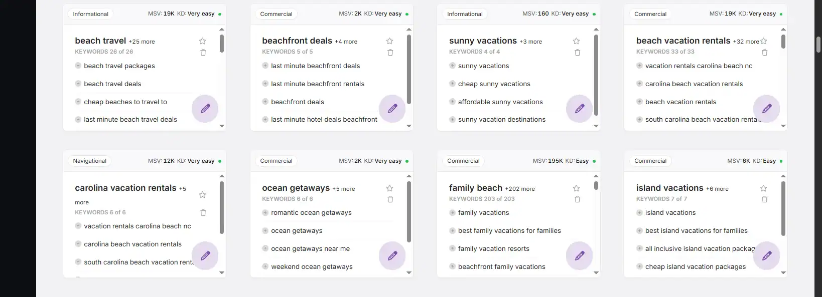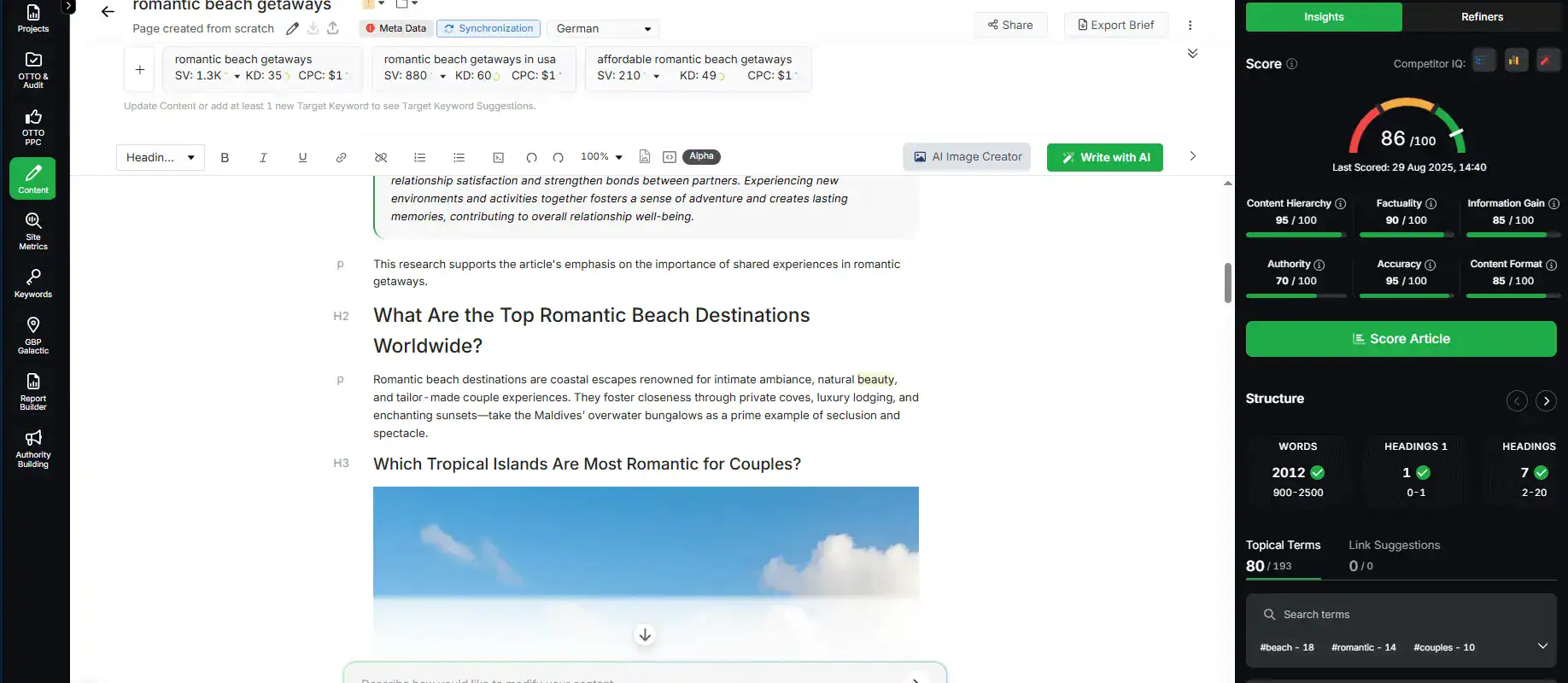 Content Genius then writes pages targeting specific traveler needs like “romantic ocean getaways.” Each draft includes proper headings and destination keywords based on actual travel searches.