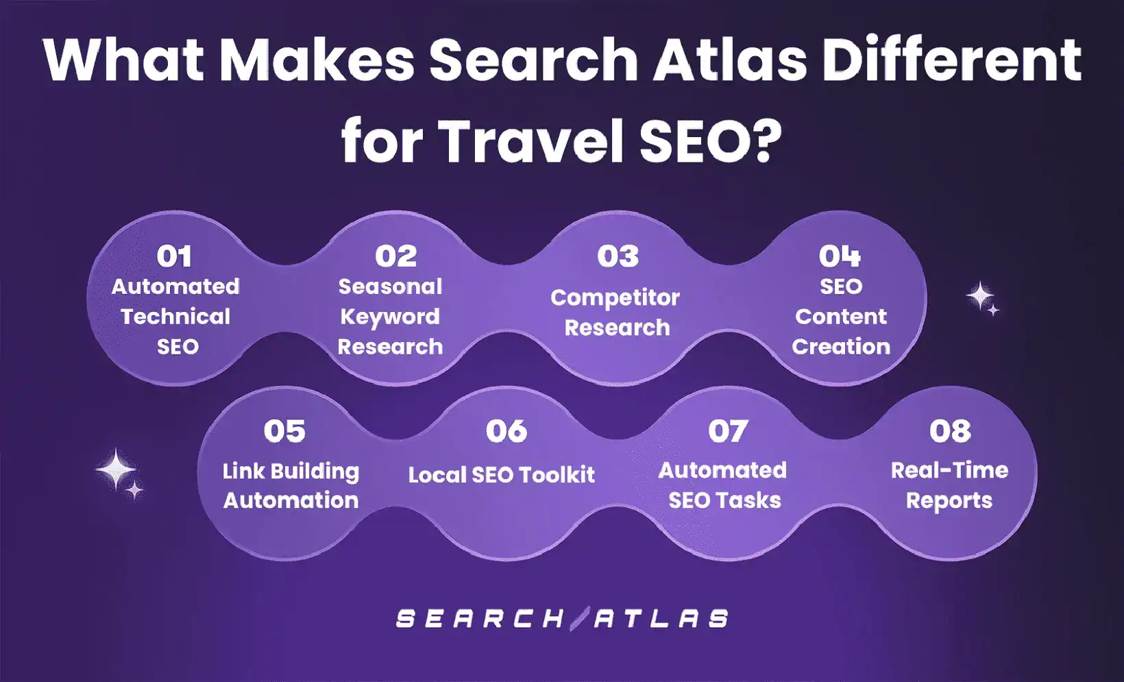 The 7 main ways Search Atlas improves travel SEO are listed below.