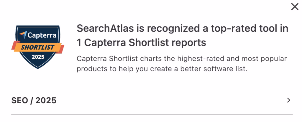 Search Atlas appears in the Capterra Shortlist, which features top-rated tools based on user satisfaction and overall popularity among verified buyers.