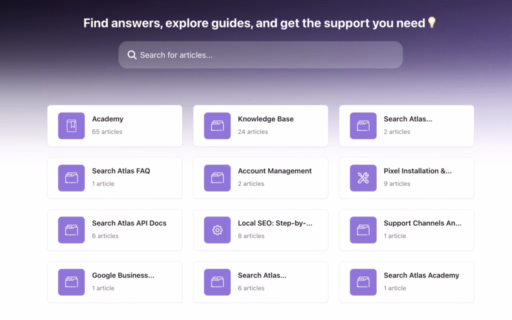 The Search Atlas Help Center includes more than 80 searchable articles covering every feature, while the built-in Training Academy provides video tutorials and best-practice workflows for SEOs at every experience level.