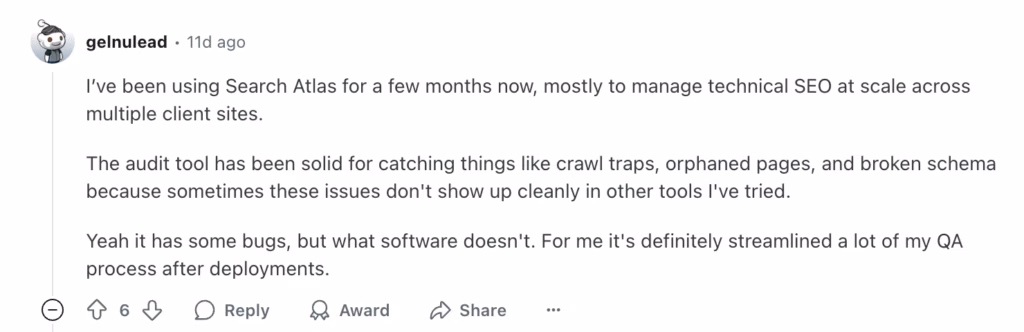 Reddit users generally speak positively about Search Atlas, especially for its technical SEO tools, automation capabilities, and agency-friendly setup. Many describe it as a valuable all-in-one platform that simplifies campaign management across multiple clients and domains.
