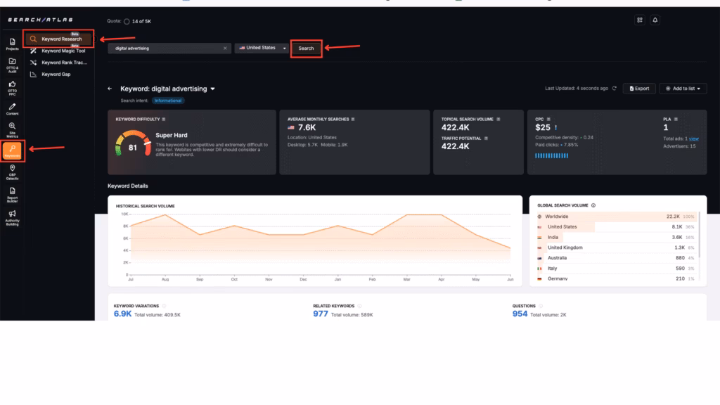 The Search Atlas Keyword Research Tool is a feature built for discovering keyword opportunities, evaluating ranking difficulty, and guiding scalable SEO and PPC strategy. The Search Atlas Keyword Research Tool provides access to over 5.2 billion keywords, which includes exact-match terms, long-tail variations, and question-based queries.