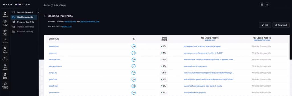 The Search Atlas Backlink Gap Analysis helps users prioritize outreach by surfacing high-quality, relevant websites that already link to similar content. Teams use these insights to target proven link sources, improve authority signals, and build a stronger off-page SEO strategy.