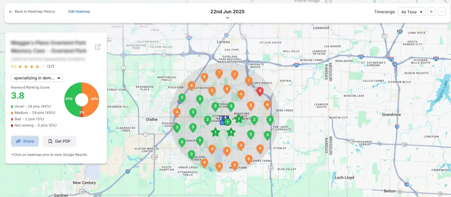 The Local Heatmaps tool simulates Google Maps searches at multiple points within a set radius. It displays average, best, and worst keyword positions in specific ZIP codes, neighborhoods, or districts. Each scan helps identify ranking gaps tied to proximity, prominence, and relevance.