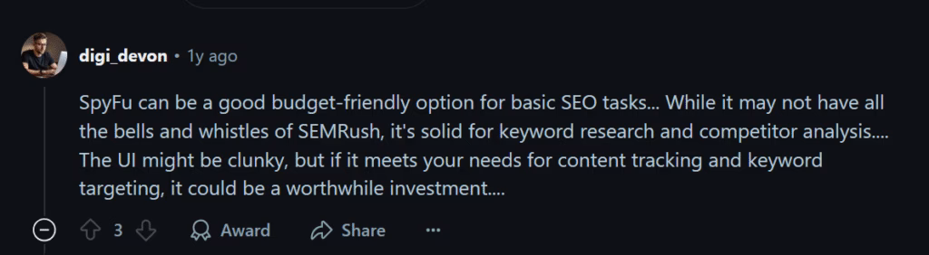 According to Reddit users, SpyFu has developed a reputation as a competent mid-tier SEO tool that occupies a specific niche in the market. The platform is generally viewed as a practical choice for marketers operating with limited budgets.