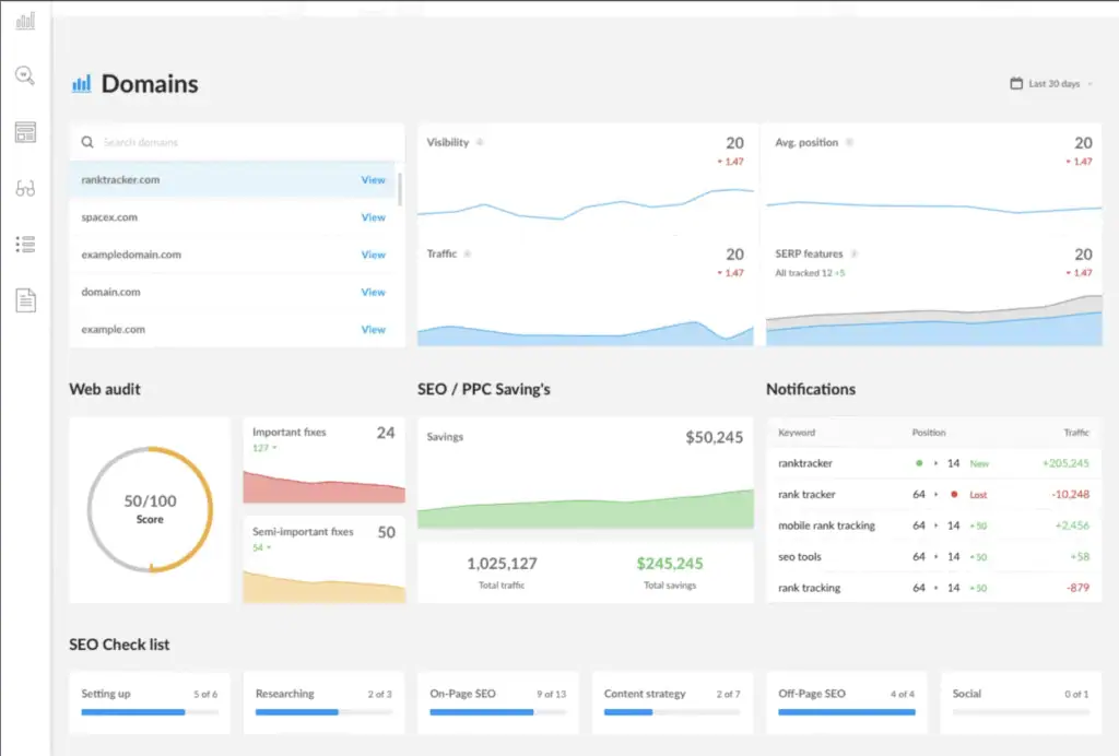 Ranktracker is an SEO platform that combines keyword monitoring, backlink analysis, SERP evaluation, and site auditing into one toolkit. Ranktracker supports both desktop and mobile tracking, with targeting options down to city and ZIP code.
