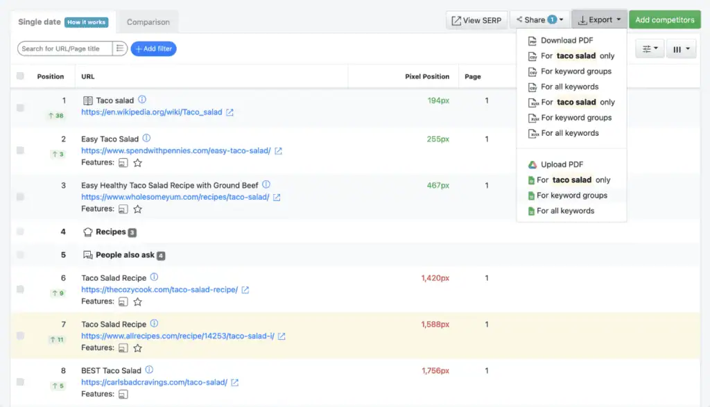 Compared to Wincher, SERPWatcher focuses on presentation rather than depth. Its dashboards emphasize interactive charts, SERP previews, and easy-to-share reports, while Wincher provides more traditional competitor tracking and reporting.