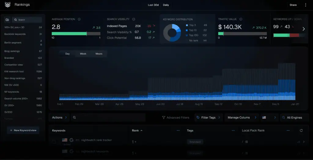 Nightwatch is an SEO monitoring platform built for agencies and growth-focused businesses that manage large keyword sets across multiple regions. Nightwatch offers track coverage in more than 190,000 locations worldwide.