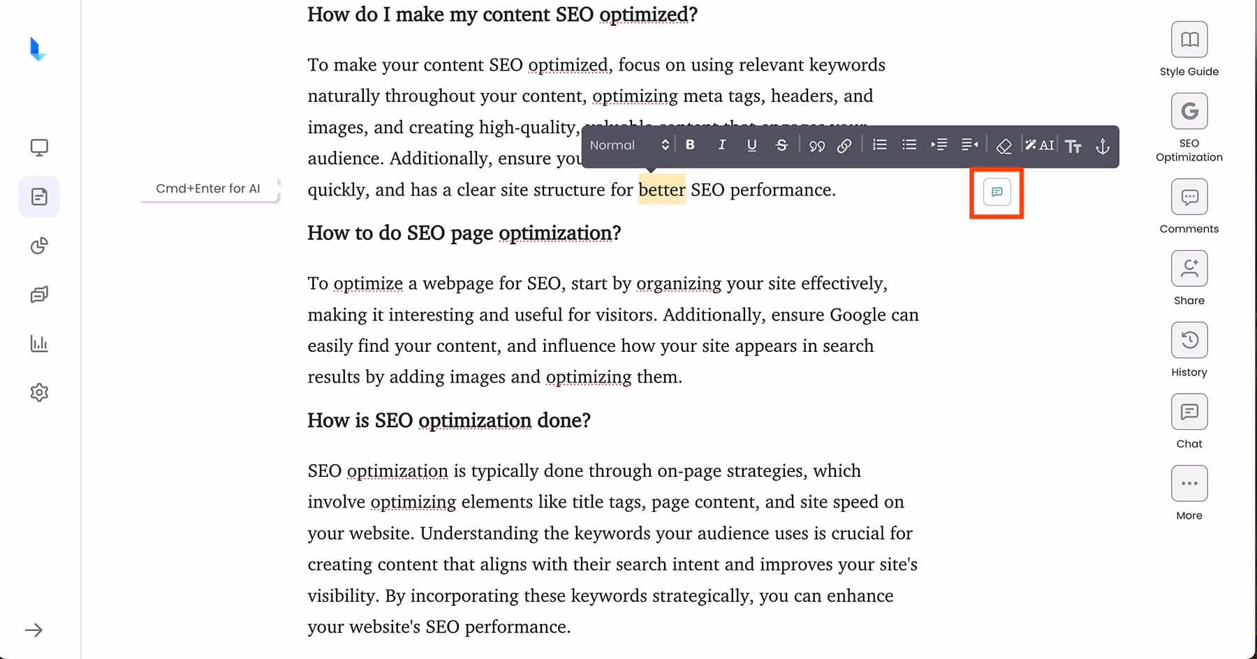 • Built-In SEO and Content Intelligence. Prioritize alternatives with keyword research, topical mapping, content scoring, and SERP comparison. SEO-aware writing replaces manual optimization steps.