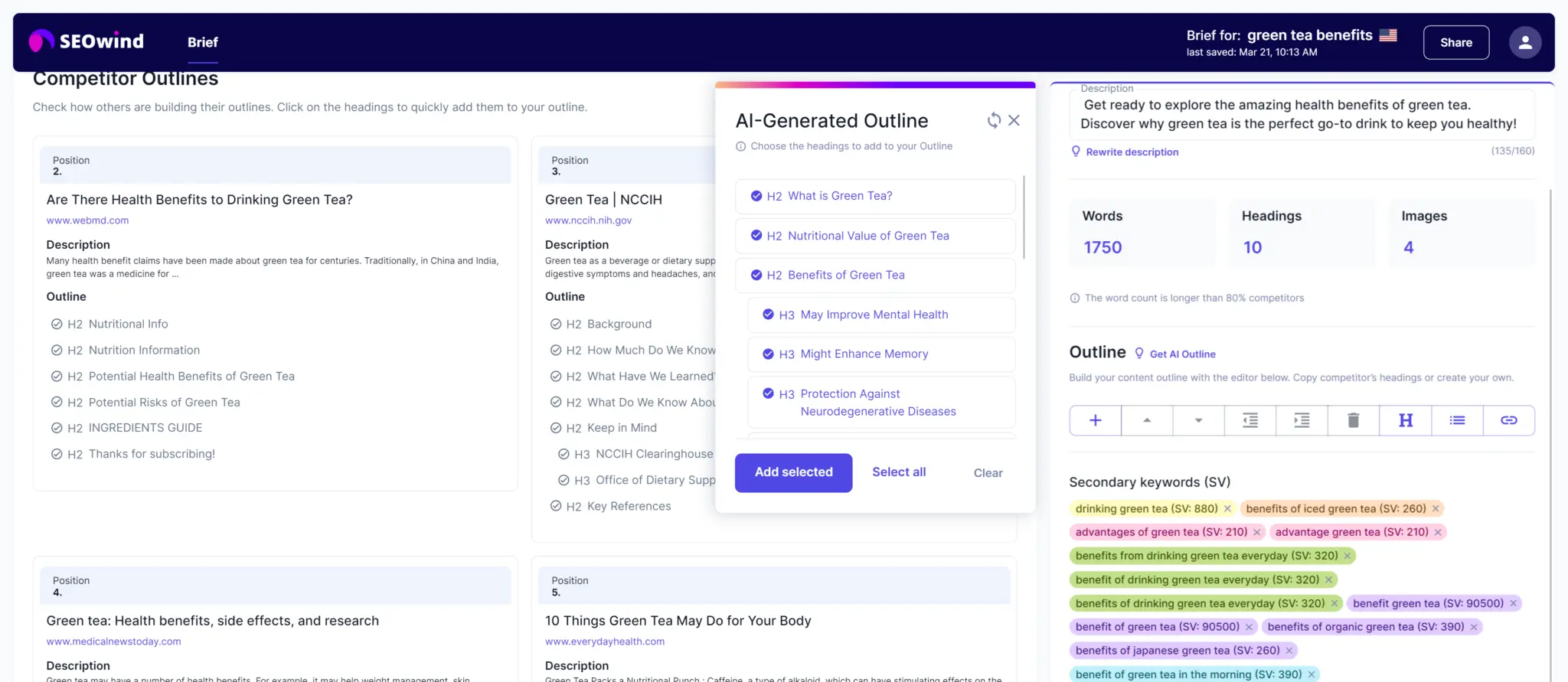 21SEOWindSEO briefs and content outlines$59 to $359/month