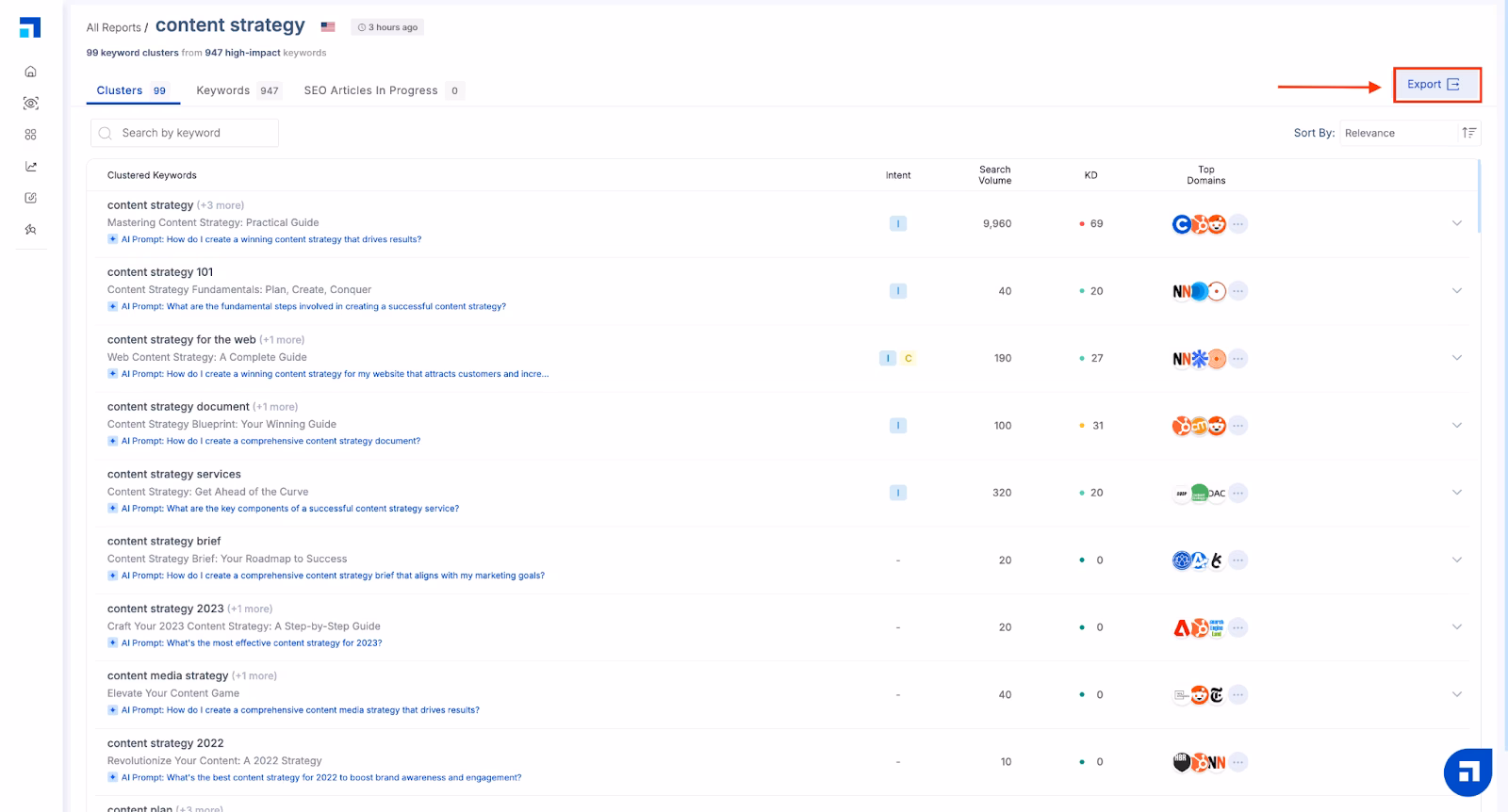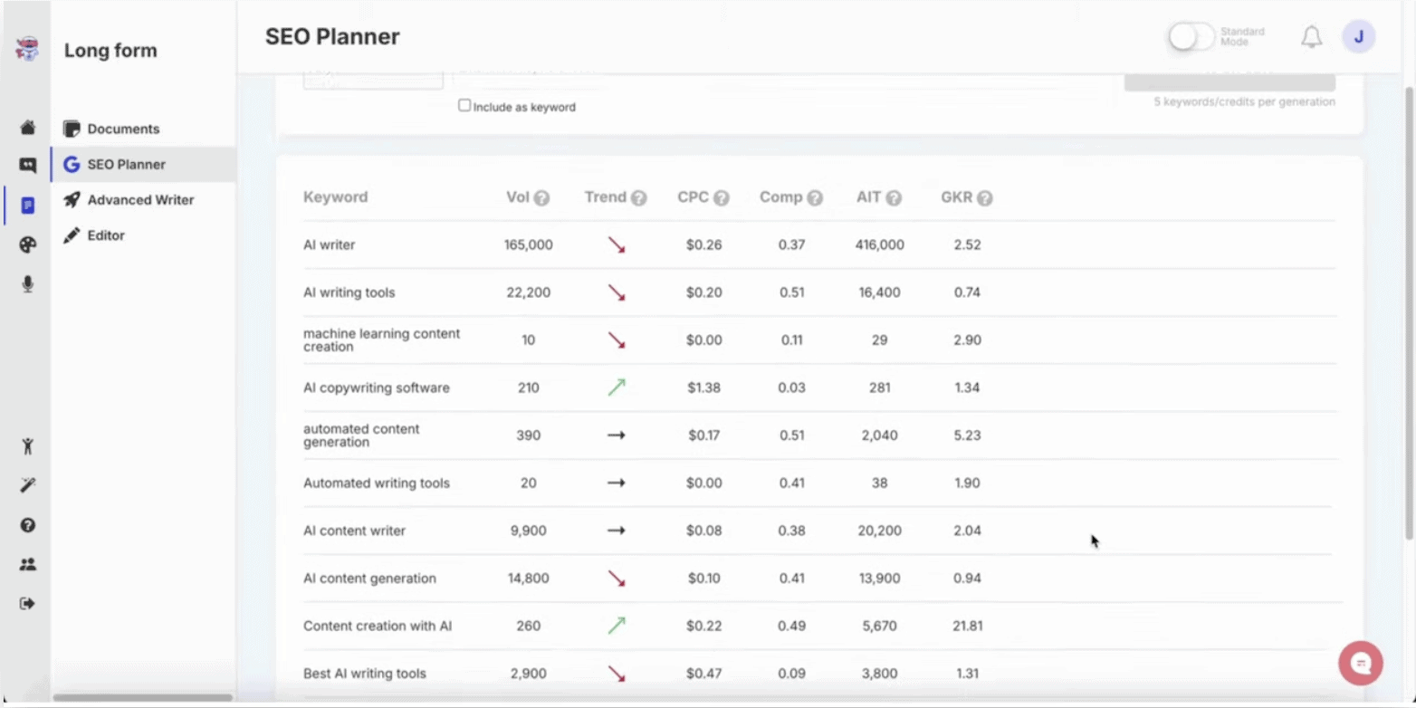 Strategic planning happens through Content Planner, which converts a single keyword into hundreds of semantically grouped topics organized by intent and opportunity. These clusters guide long-term content architecture for blogs, hubs, and large editorial programs. HyperWrite does not provide keyword clustering or topic mapping.