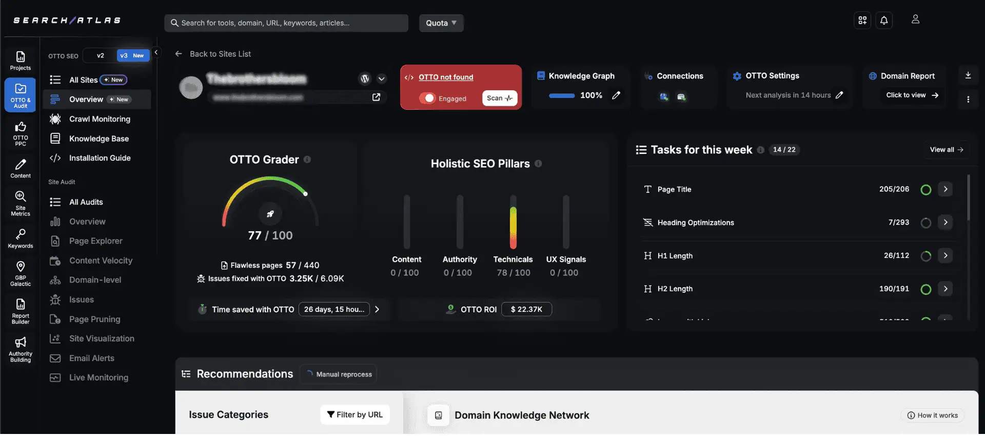 Search Atlas adds a critical layer that HyperWrite does not offer. Search Atlas On-Page SEO Audits evaluate content depth, structure, internal linking, metadata, schema, technical health, and UX signals for any URL. OTTO SEO applies approved fixes directly to live pages, removing manual optimization work.
