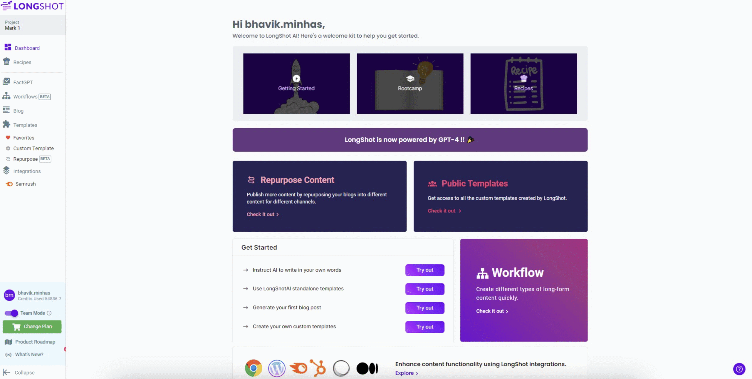 Core features in LongShot AI focus on accuracy and depth. FactGPT validates claims against trusted sources. Citation tools verify references. A Semantic SEO Checker compares drafts to ranking competitors. Publishing integrations connect content to WordPress and Google Docs.