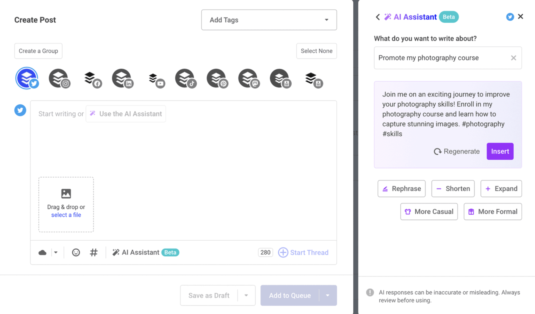 19Buffer AI AssistantAI social media captions and posts$0 to $10/channel/month