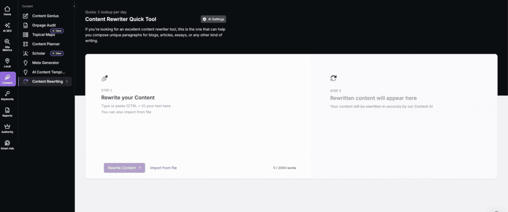 Search Atlas provides fast rewriting through the Content Rewriter Quick Tool, which refreshes up to 350 words at a time. It offers customizable tone, perspective, and language while preserving meaning. This tool gives writers the quick editing flexibility they expect from QuillBot with the added advantage of SEO context and cleaner phrasing.
